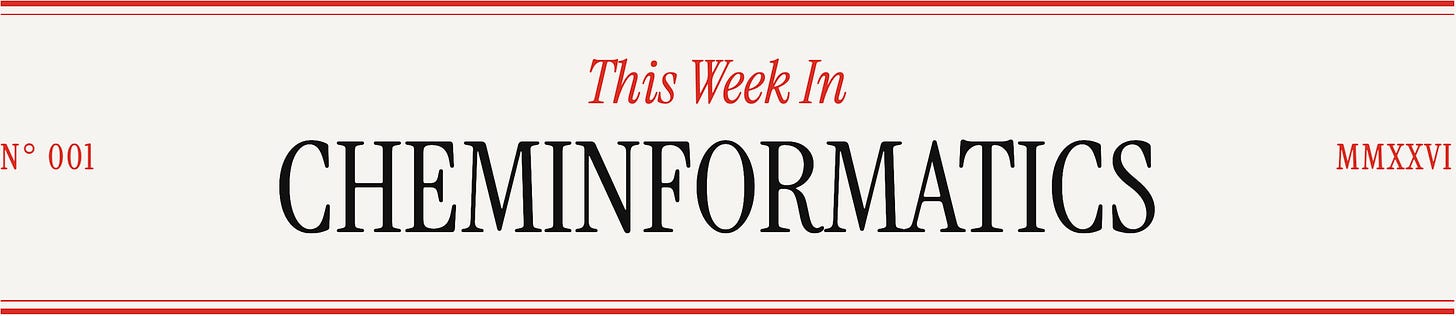 This Week in Cheminformatics is (supposed to be a) weekly curation of publications, preprints, code, and datasets. The scope covers cheminformatics, molecular modeling, and machine learning for drug discovery. The focus here is utility over engagement, so do with these links what your heart desires. Every Monday, I will share the previous week’s technical updates alongside any specific items that catch my eye.